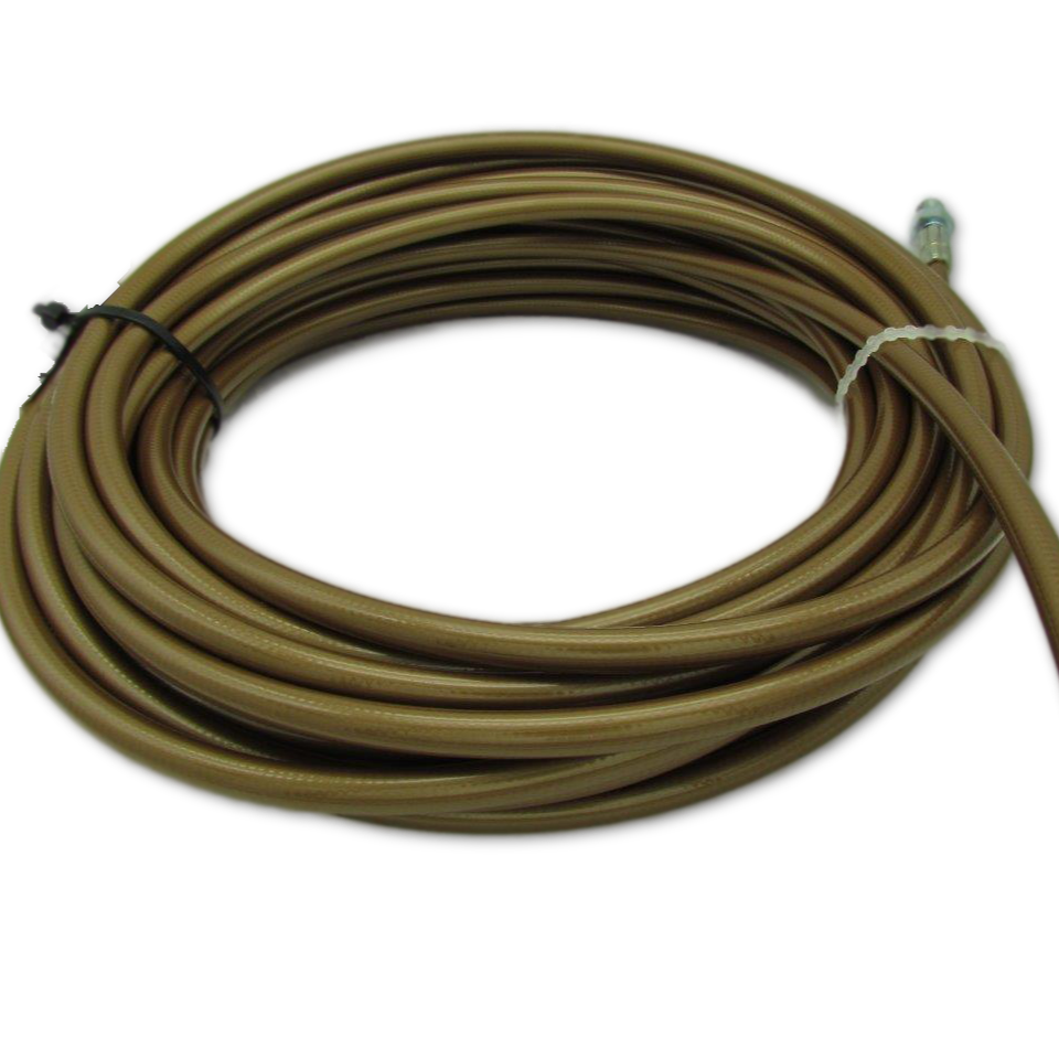 The BRONZE-FLEX MINI/TRAP HOSE is great for navigating elbows & traps in 1½"-3" pipes. With a 3/16" I.D this hose is 50% larger Inside-Diameter than common 1/8" jetting hoses to allow more water-flow & less PSI-drop while jetting. Unlike common 1/8" jetting hose, the Bronze-Flex hose has a steel inner braid giving it maximum push-ability as it is less apt to “ball up” when pushed into a line or trap. The bronze outer jacketing provides smooth navigation around elbows & P-Traps when paired with our 1/8" Stainless Steel “KnuckleHead” Nozzle, getting you through traps in a fraction of the time.