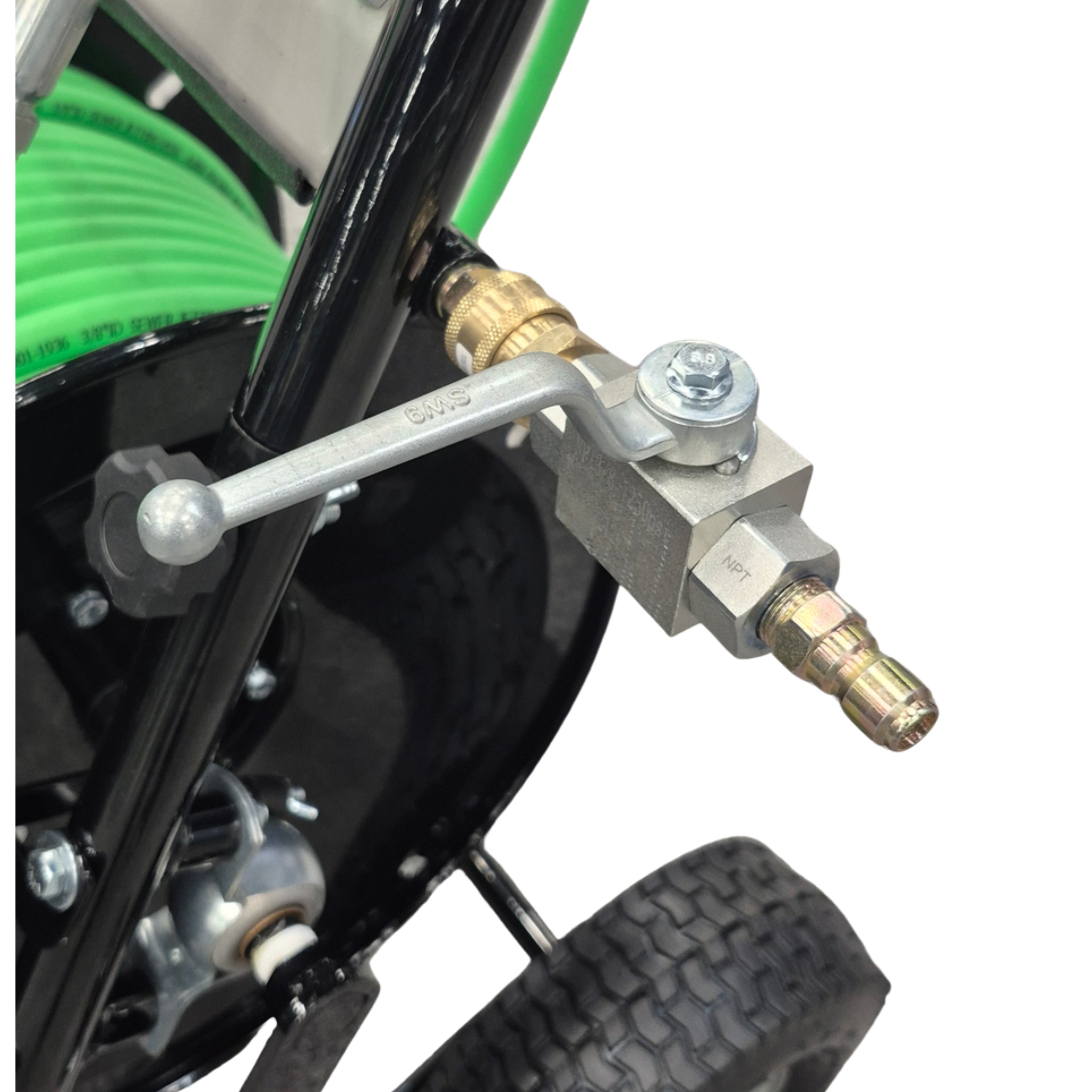 Includes: Panel with Pressure Gauge & 3-Nozzle Storage, quick-coupled Flow-Control Valve, wide Pneumatic Tires, & Pin-Lock