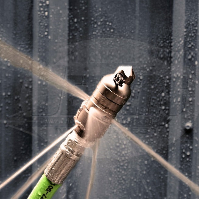 High-torque internal "Turbine" keeps chains spinning at high RPM to remove scale and tuberculation from the pipe walls, as well as tree roots, hardened grease, etc.  A rotating boring-head at the nozzle's nose cores into blockages.
