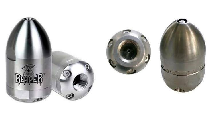 - “Reduced Rotation-Speed” nozzles such as the REAPER, WARTHOG, GREASE-HOG, & others are designed specifically for attacking/clearing tougher blockages like tree-roots, hardened grease, packed wipes, eggshell, etc. Also, Reduced Rotation-Speed nozzle types are often used for clearing heavier buildup that requires a more intense scouring of the pipe.