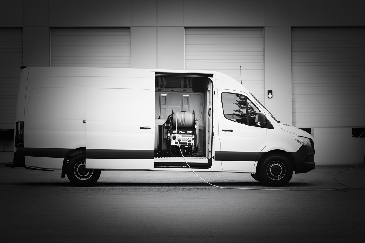 Built for vans and trucks where every inch counts, the BRUTE POWERSLIDE turns your vehicle into a compact, service-friendly jetting rig. The electric-powered base positions the jetter and hose reel outside the vehicle during use, making operation and maintenance easier while keeping heat, noise, and fumes out of the cargo area.